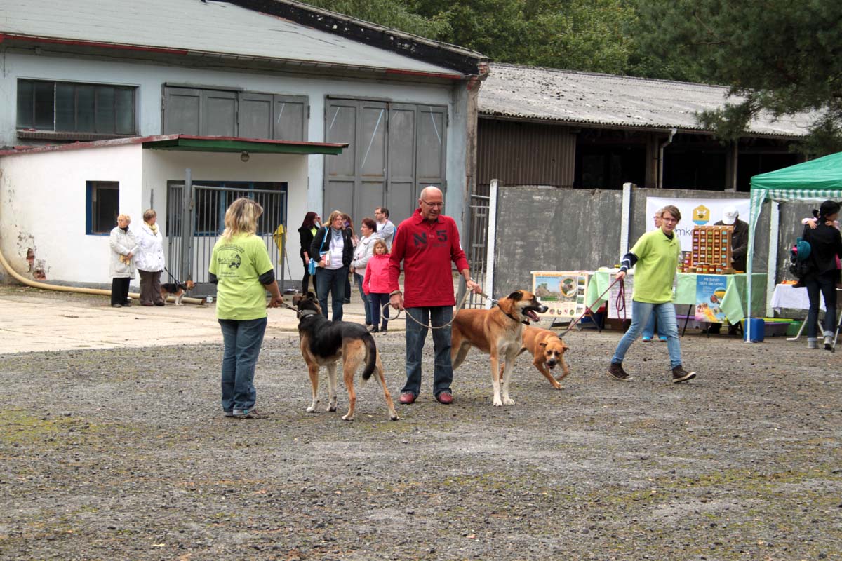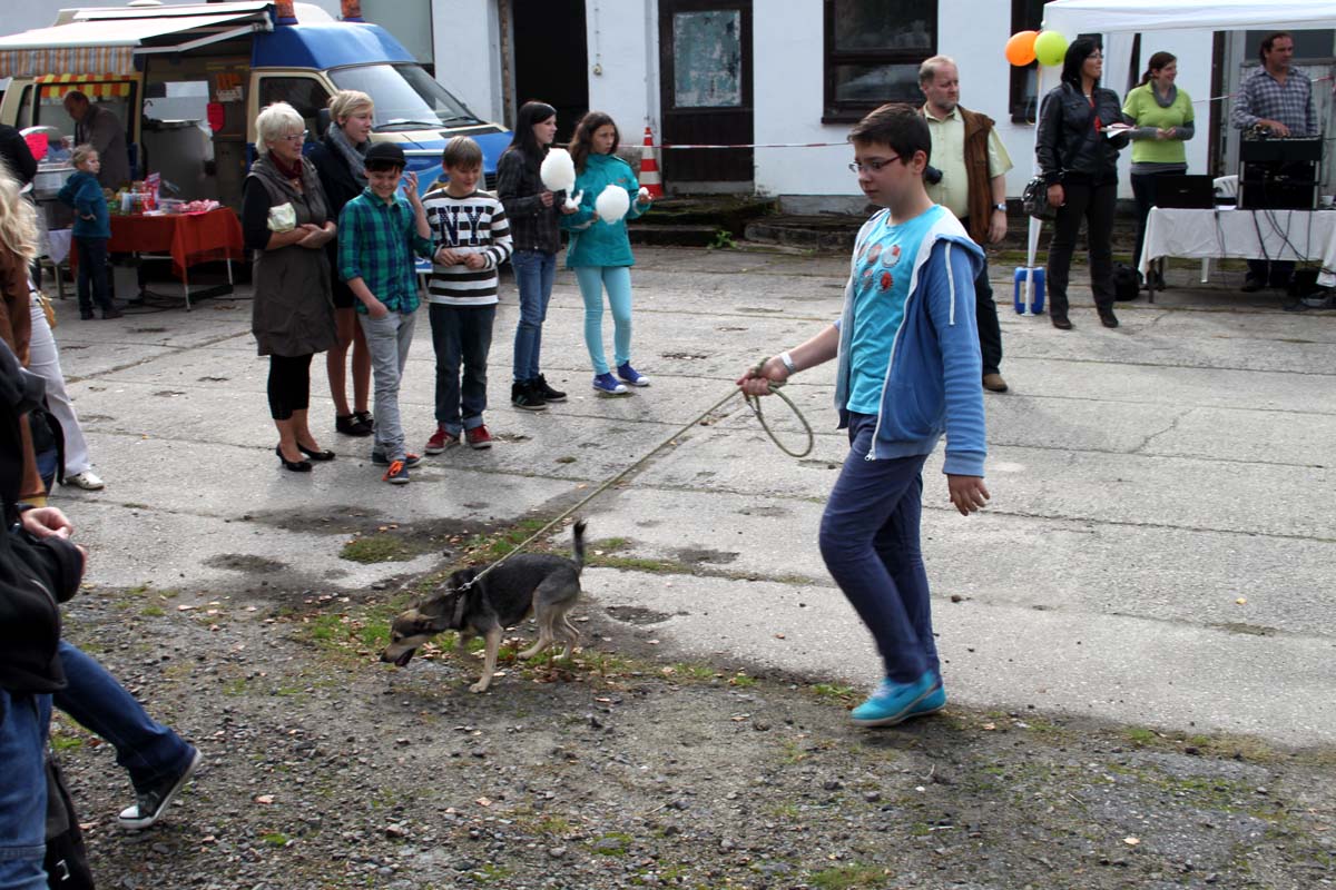 Auch unsere Hundevorführungen wurden diesmal unter verschiedene Mottos gestellt. Da kamen die „Zwerge“, die „Gemütlichen“, die „Eisbären“ und die „Riesen“ auf die Bühne. Und auch unser Gigant unter den Tierheimhunden, „Chacco“, durfte beim Programm nicht fehlen und sorgte im Publikum für staunende Gesichter, als Tierpflegerin Sabine ihn mit Pferdehalfter gesichert durch die Menge führte. Jedoch nicht nur Chacco wurde bewundert, einige unserer Hunde durften erste Kontakte mit ihren vielleicht zukünftigen Herrchen und Frauchen knüpfen. Als ganz besonderes Sorgenfellchen wurde Jaimy auf der Bühne vorgestellt. Bei dem armen Kerl wurde erst vor wenigen Tagen eine Kehlkopflähmung festgestellt. Er muss für viel Geld in einer Spezialklinik operiert werden, damit er noch ein langes Leben hat. Dank unserer lieben Besucher und ihren vielen Spenden an diesem Tag, können wir nun Jaimy in Kürze operieren lassen.