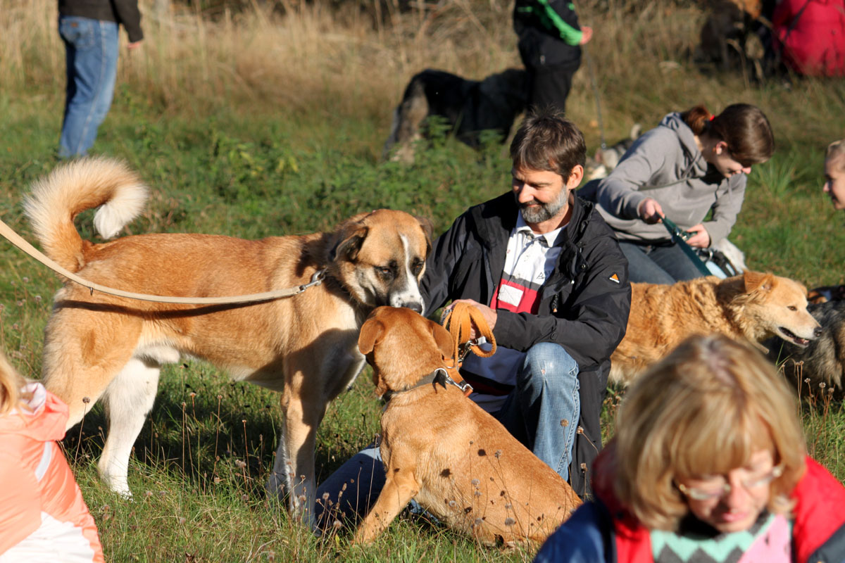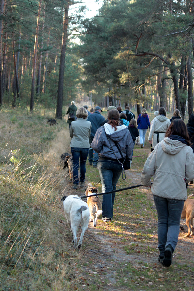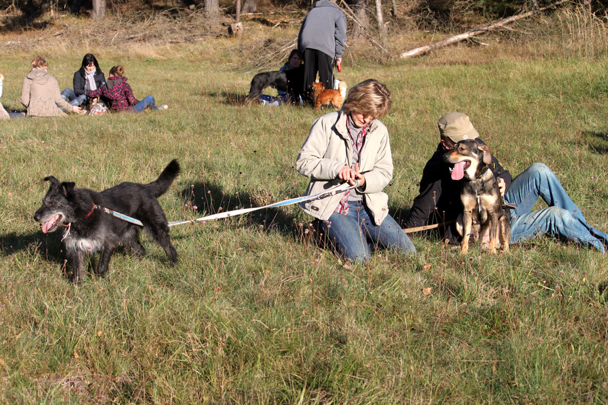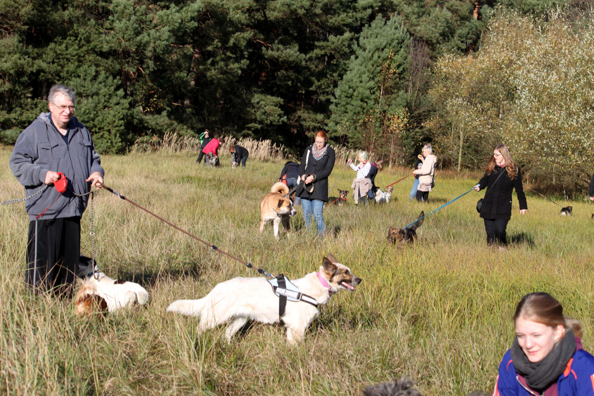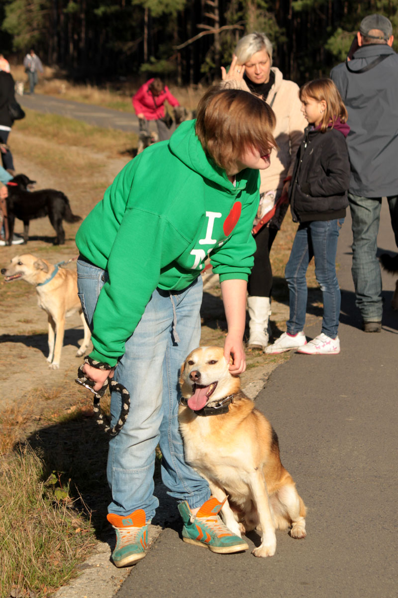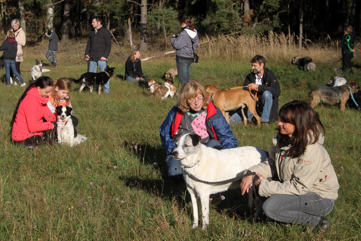 Am Reformationstag trafen wir uns zur 3. Tierheim-Hundewanderung 2013. 45 Hundefreunde mit 32 Tierheimhunden und 7 ehemaligen Schützlingen machten sich auf eine 3,5 stündige Tour durch unsere ans Tierheim grenzenden Wälder und Wiesen. Vorbei an zwei Waldseen, bei herrlichstem Sonnenschein, haben alle das traumhafte Wetter und die gute Laune von Mensch und Tier genossen. Für unsere Tierheimschützlinge war die Wanderung wieder eine tolle Abwechslung vom Tierheimalltag. Alle liefen nach kurzem anfänglichen Ziehen und Bellen brav nebeneinander her, ließen sich in den Pausen kuscheln und knüpften Freundschaften untereinander.