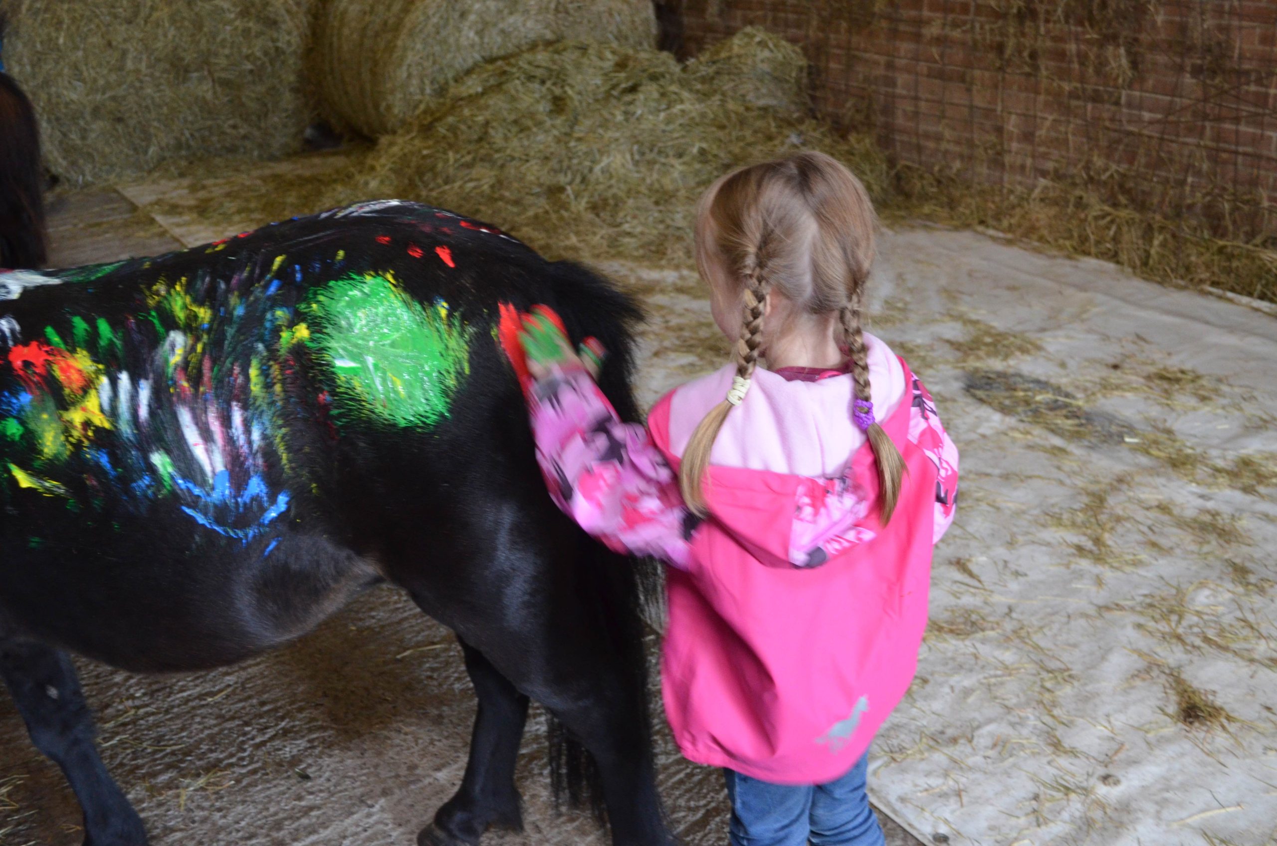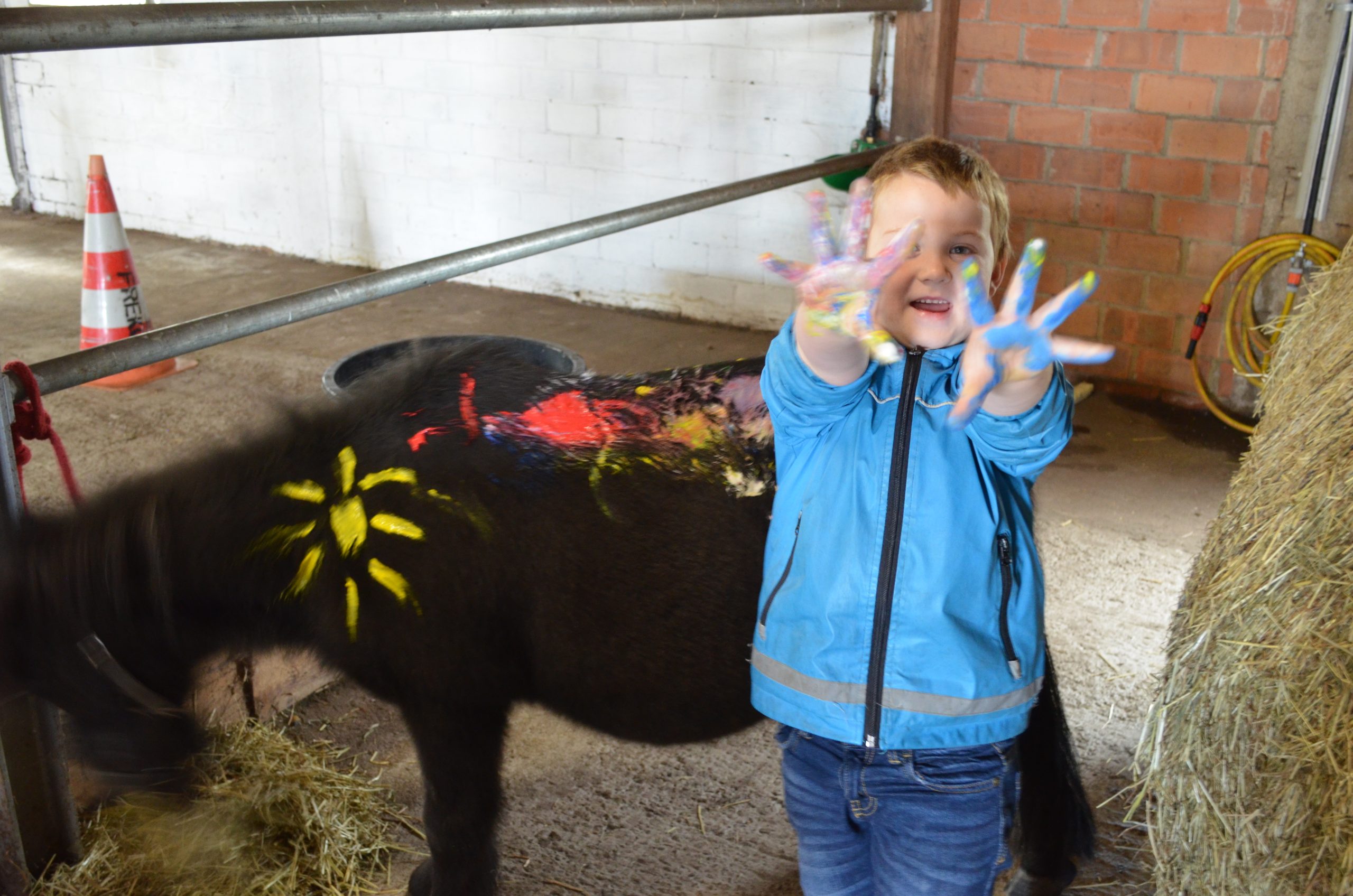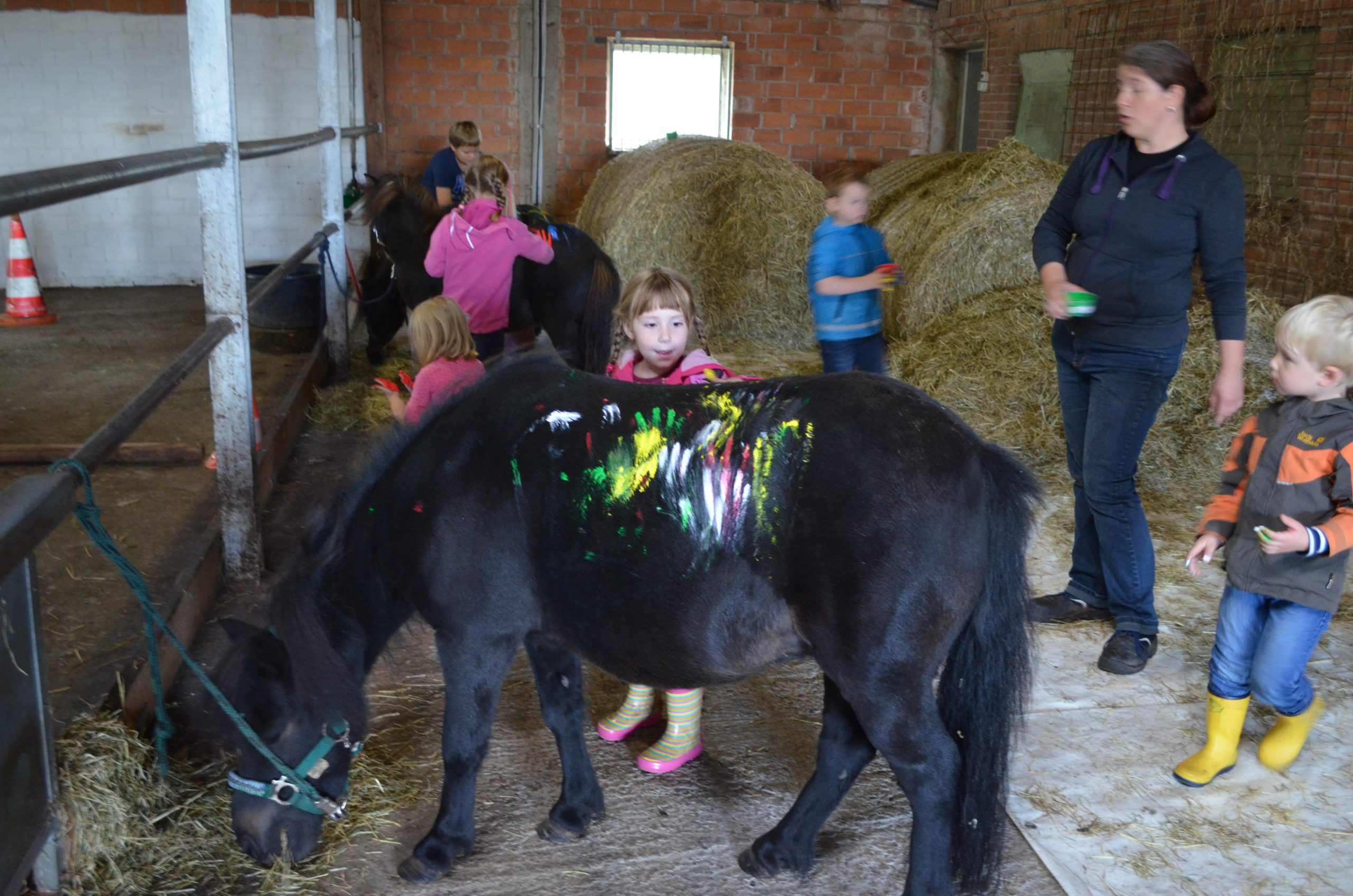 Besonderen Spaß hatten die Kinder beim Bemalen der Ponys, wobei hier auch galt, dass Beine, Bauch, Kopf, Hals sowie Mähne und Schweif tabu waren. Alle sieben Kinder waren sehr kreativ und die 3 Pony-Zwerge genossen es sehr bei einer kleinen Portion Heu etwas „massiert“ zu werden.