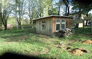 Der Auslauf ist fertig und gemäht. Der alte Hühnerstall ist von innen sauber gefliest und hat neue Fenster und eine vernünftige Tür bekommen.
